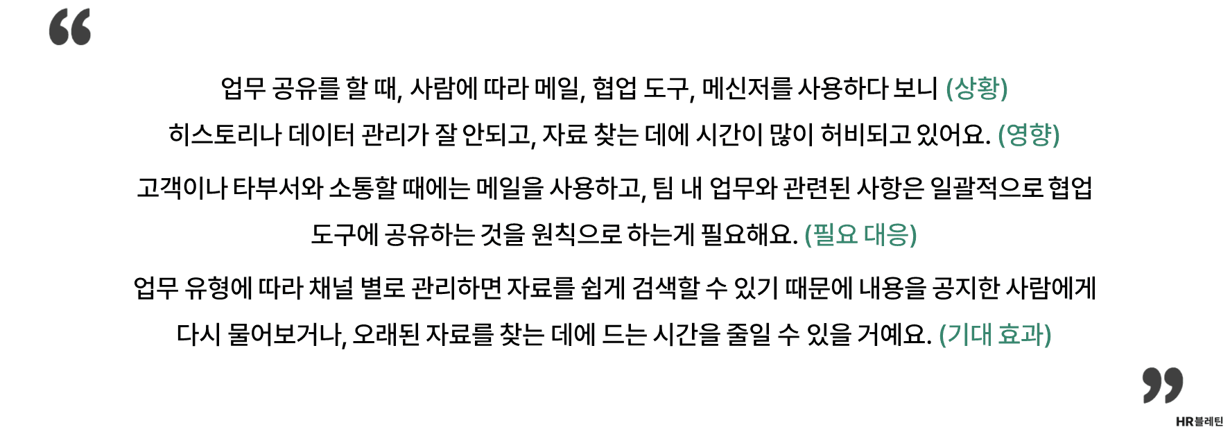 “고객이나 타부서와 소통할 때에는 메일을 사용하고, 팀 내 업무와 관련된 사항은 일괄적으로 협업 도구에 공유하는 것을 원칙으로 하자”라고 필요 대응만 말한다면 그 배경을 알 수 없기 때문에 “왜?”라는 반응이 나올 수 있습니다. 그러나 제안의 맥락을 함께 전달하면 상대방의 의도를 이해할 수 있게 도울 뿐만 아니라 ‘실제로 이런 상황이 일어나고 있나? 이 대응이 필요한가? 대응으로 인해 좋은 결과를 얻을 수 있는가?’ 즉 의견 자체에 초점을 맞추게 되기 때문에 제안에 동의하지 않더라도 건설적인 논의로 이어지게 됩니다.