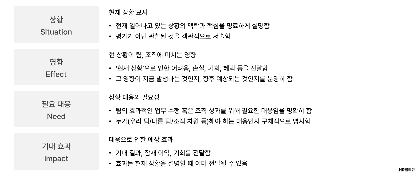 일상적인 소통에서 내 생각과 그 배경을 전달하는 것은 그다지 어렵지 않을 겁니다. 그러나 업무와 관련하여 의견의 맥락을 충분히 전달하는 것은 까다롭게 느껴질 수 있습니다. 그래서 의견을 제시할 때 활용할 수 있는 공식을 알려 드리려고 합니다. 바로 상황(Situation), 영향(Effect), 필요 대응(Need), 기대 효과(Impact) 구조로 의견을 전달하는 것입니다.