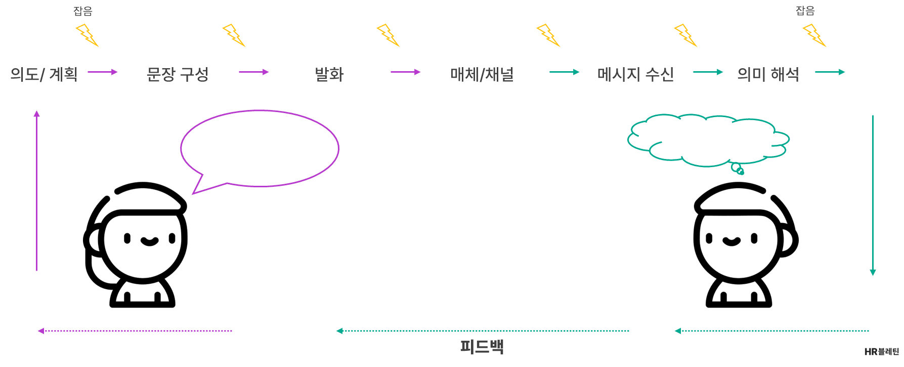 우리가 의사소통하는 과정을 살펴 보면, 자신이 의도, 생각, 감정을 적절한 단어나 문장으로 구성하여 말로 잘 전달하고, 이것을 상대방이 듣고 그 의미를 해석하게 됩니다. 즉, 말하는 사람이 자신의 생각, 감정, 의도를 충분히 전달할수록, 듣는 사람이 말하는 사람에 대한 정보, 배경 지식이 많을수록 서로 통할 가능성이 높아진다는 것입니다. 반대로 의도를 적절한 문장으로 구성하지 못하거나, 문장에 적합한 발성으로 표현하지 못한다면(예: 우는 소리로 “신나요”라고 말함) 내가 의도한대로 말이 전달되기 어려울 겁니다. 그리고 상대방이 아무리 정확하게 말을 전달했다 하더라도 듣는 사람이 집중하지 않아 이야기를 제대로 수신하지 못하거나, 의미 해석 단계에서 상대에 대한 편견이 작용한다면 말한 사람의 의도대로 이해되지 않겠죠.