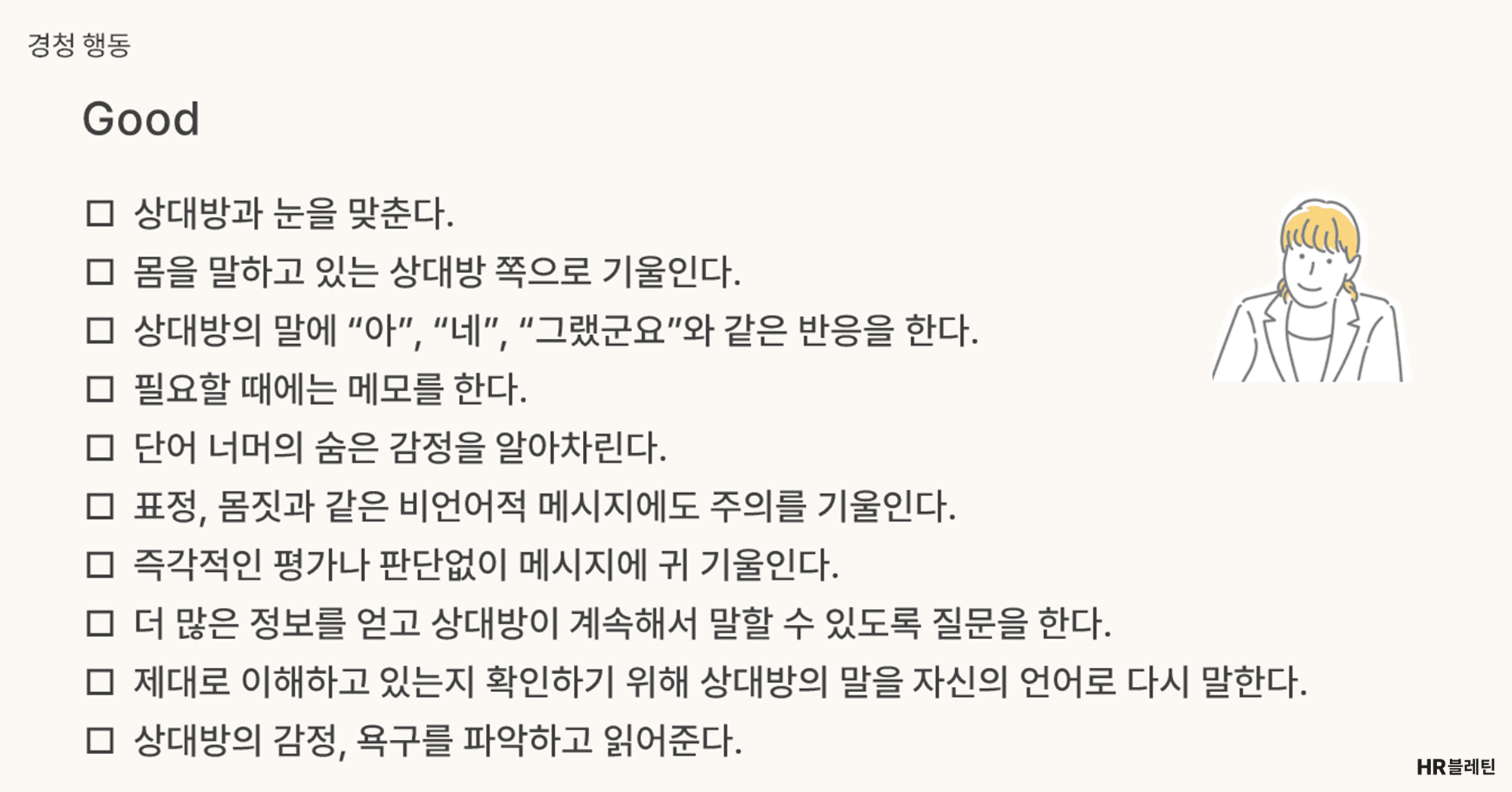 반면 Good에 나열된 행동들은 몸, 머리, 마음으로 상대방의 이야기를 듣고 반응하는 모습을 나타냅니다. 눈맞춤, 몸의 기울임, “아”, “네”와 같은 추임새부터 질문이나 ‘자신의 언어로 다시 말하기’와 같이 자신이 이해한 것이 맞는지 확인하는 행동 등은 정확한 의사소통을 높입니다. 동시에 상대로 하여금 “상대방이 내 이야기를 주의 깊게 듣고 있구나”라는 메시지를 전달하고 존중받는 느낌을 갖게 합니다. 특히, “기한 내에 완성하려고 저녁 늦게까지 남아 고생했는데 알아주는 사람 한 명 없어 속상했구나”와 같이 상대방의 입장이 되어 마음을 읽어주는 공감은 “내 마음을 알아주는구나”라고 느끼게 하여 상대방에 대한 신뢰를 형성하고, 자신의 생각과 마음을 원활하게 제시하게 됩니다. 내 말을 상대방이 들어주는 것을 아니까요.