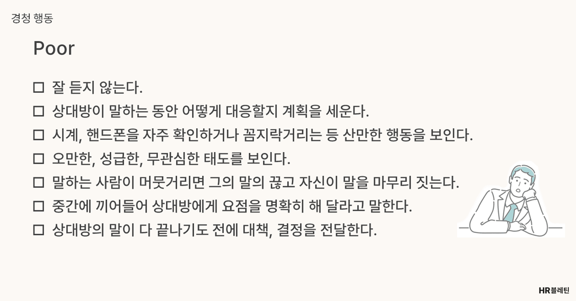 마찬가지로 의자를 뒤로 한껏 젖힌 채 팀원의 보고를 듣거나, 피곤하다는 이유로 눈을 감고 업무 보고를 듣는 행동은 ‘듣기’라는 기능에는 무리가 없지만 팀원으로 하여금 ‘존중받지 못한다’라는 느낌을 받게 합니다. 시간이 촉박해서 “결론부터 말하라”라고 지시하거나, 뛰어난 공감 능력(?)으로 상대방이 무슨 말을 하는지 알 것 같아서 중간에 말을 끊고 그의 말을 대신하는 것 또한 “무시당한다”라는 느낌을 받게 하는 요인입니다.