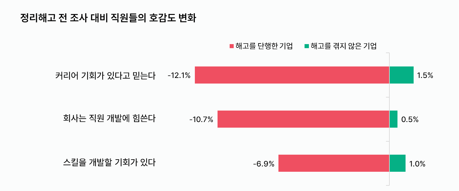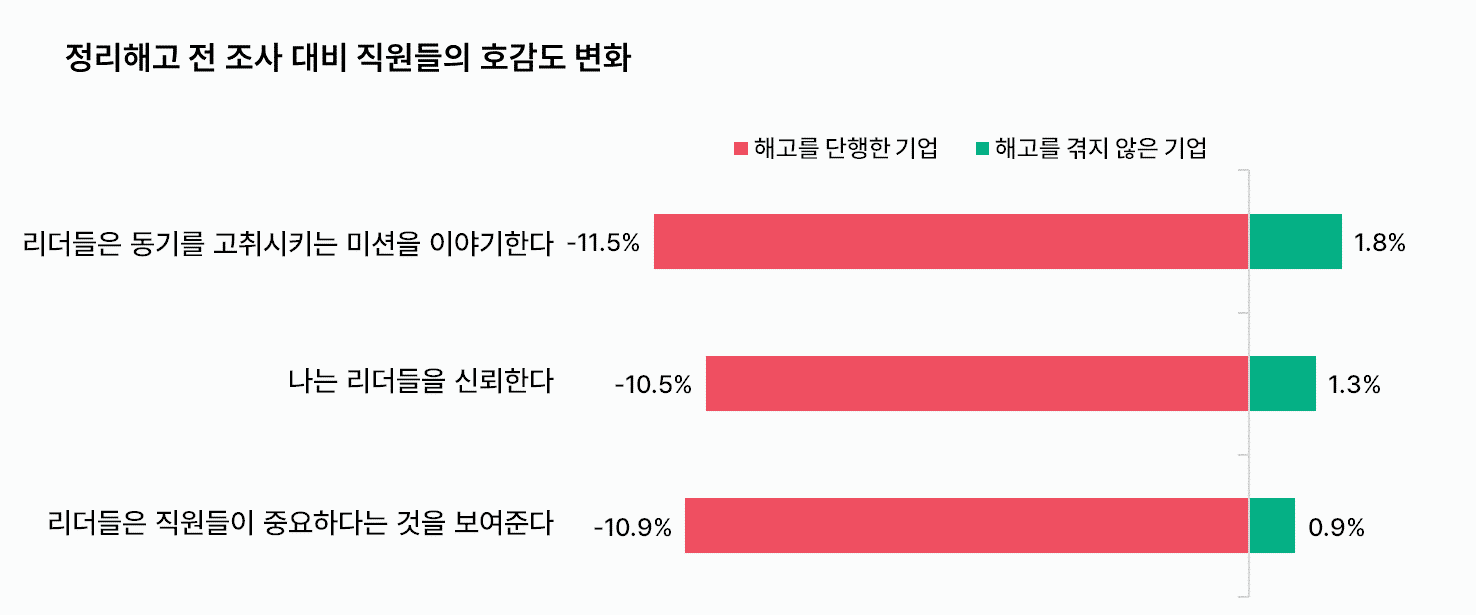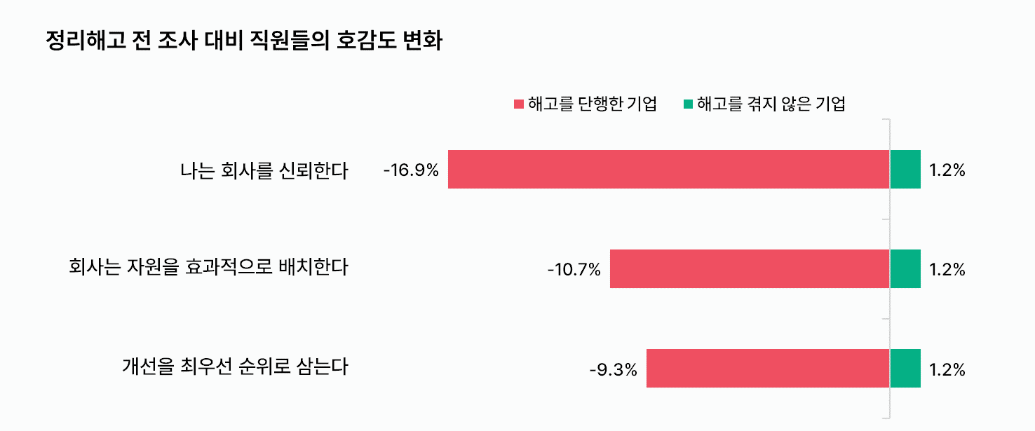 해고는 조직과 리더십에 대한 불신, 사기 저하, 불안감 등 살아남은 생존자에게도 부정적인 영향을 미친다. 이것은 해고 전후의 직원몰입 수준을 분석한 컬처앰프(Culture Amp)의 조사에서 극명하게 드러난다.