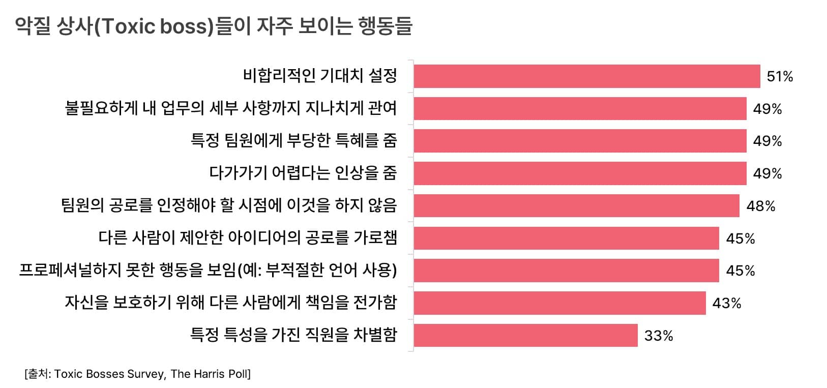 조사 기관 해리스 폴(The Harris Poll)이 미국의 직장인 1,233명을 대상으로 실시한 조사에 따르면, 10명 중 7명(71%)은 직장 생활을 하면서 악질 상사(toxic boss)를 만난 적이 있다고 밝혔다. 이들이 생각하는 악질 상사의 특성은 무엇일까? ‘비합리적인 기대치 설정(51%)’, ‘불필요하게 내 업무의 세부 사항까지 지나치게 관여(49%)’, ‘특정 팀원에게 부당한 특혜 제공(49%)’이 상위를 차지했다.