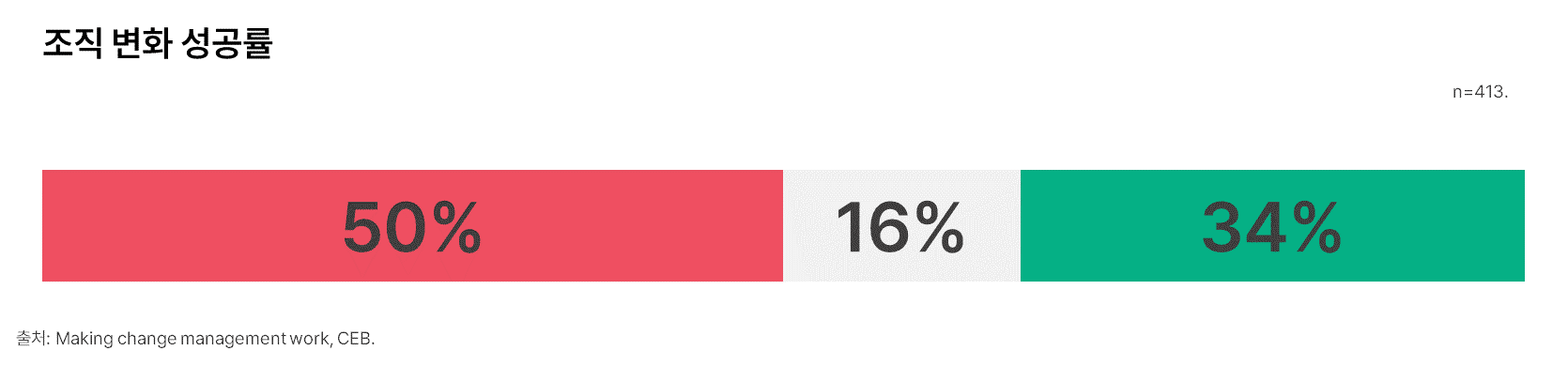 조직 변화의 주기가 점점 더 짧아지고 있다. 변화하는 외부 환경에 대응하기 위해, 내부 효과성을 높이기 위해 조직 구조, 성과제도를 포함한 조직 운영 방식을 빠르게 변경해 나간다. 조직에서 추진하는 변화 과제의 결과는 어떨까? 아쉽게도 변화 성공률은 그다지 높지 않다. 조직 변화를 추진한 기업을 조사한 CEB의 연구에 따르면, 조직 변화의 성공률은 34%에 불과했고, 실패율은 50%, 나머지 16%는 혼재된 결과를 얻었다고 밝혔다.