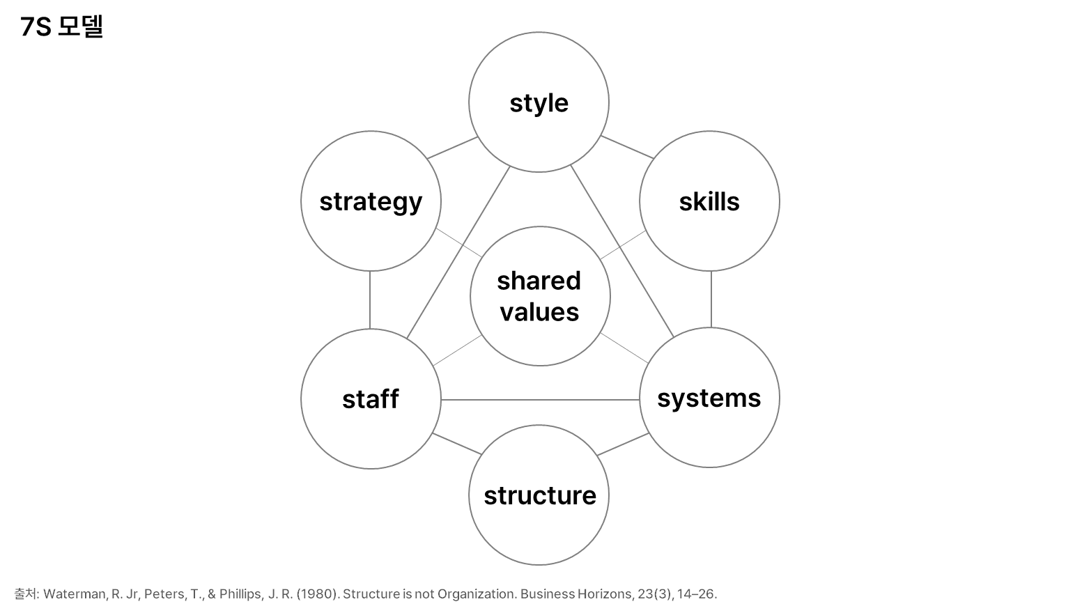 *Structure is not Organization에서는 shared values가 아닌 Superordinate Goals라는 용어가 사용되었으나 현재 통용되는 명칭에 맞게 수정하여 표기함