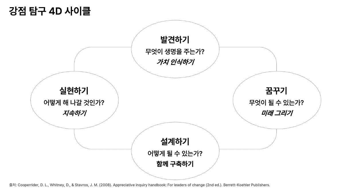 조직의 강점을 발견하고 극대화하는 과정은 발견하기(Discovery)-꿈꾸기(Dream)-설계하기(Design)- 실현하기(Destiny) 4D 단계로 진행된다. 문제 중심적 접근은 외부 컨설턴트와 내부 관리 부서가 주축이 되어 설문조사와 인터뷰를 통해 조직을 진단하고 개선 방안을 도출하는 경우가 많다. 반면 강점 탐구에서는 구성원 간 1:1 인터뷰, 토론 등 대화를 주요 방법론으로 삼고, 이 과정에 최대한 많은 구성원들을 참여하게 한다.