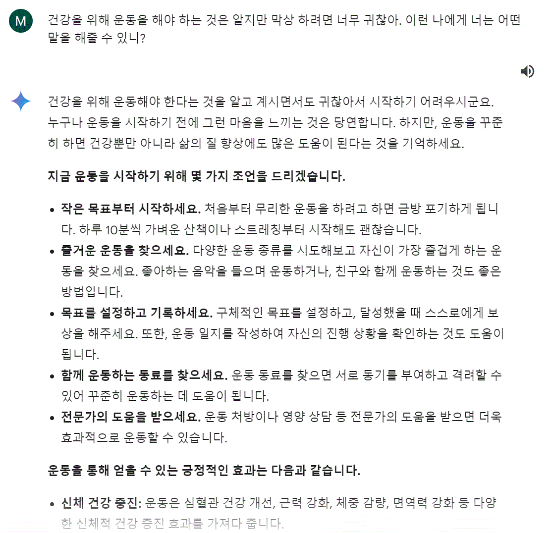 앞서 소개한 운동 동기부여 요청문에 다음과 같이 페르소나를 부여해 보았다. “건강을 위해 운동을 해야 하는 것은 알지만 막상 하려면 너무 귀찮아. 이런 나에게 너는 어떤 말을 해줄 수 있니? 공감적이고 compassionate 태도를 보여줘” 그러자 건조하게 정보만 나열했던 이전과는 달리 마음을 어루만지는 표현이 이어졌다.