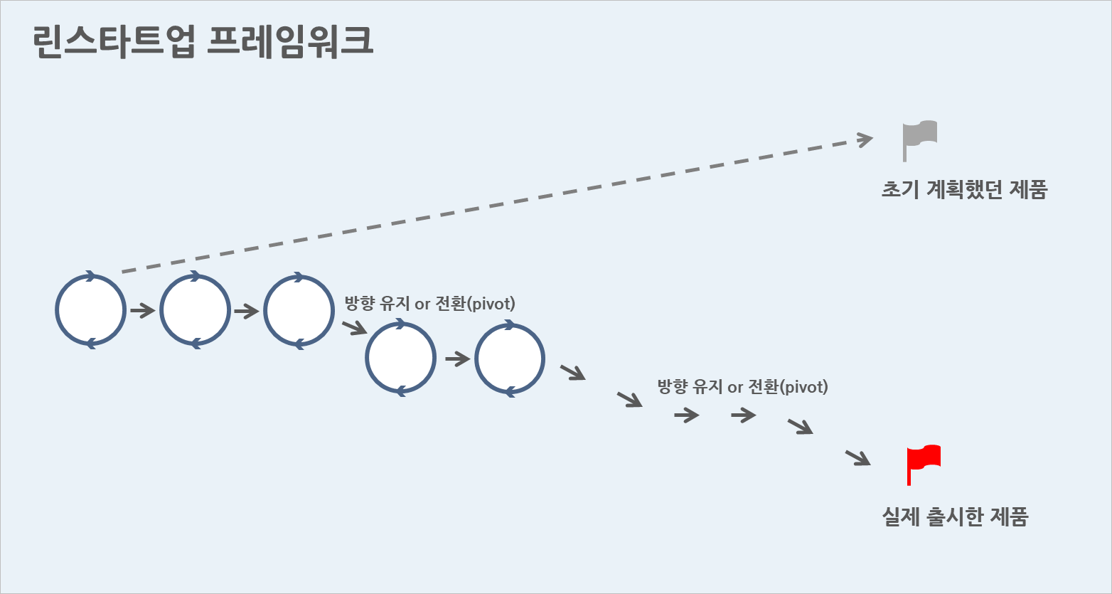 순환 루프를 반복함에 따라 회사가 바라는 이상적인 방향으로 나아가고 있다면 계속 그 방향으로 진행해도 되지만, 그렇지 않다면 전략이 본질적으로 잘못 된것을 인정하고 변화를 추진해야 한다. 방향전환(pivot)을 결정했다면, 출발선을 다시 잡고 거기서부터 만들기-측정-학습 사이클을 시작하면 된다.
