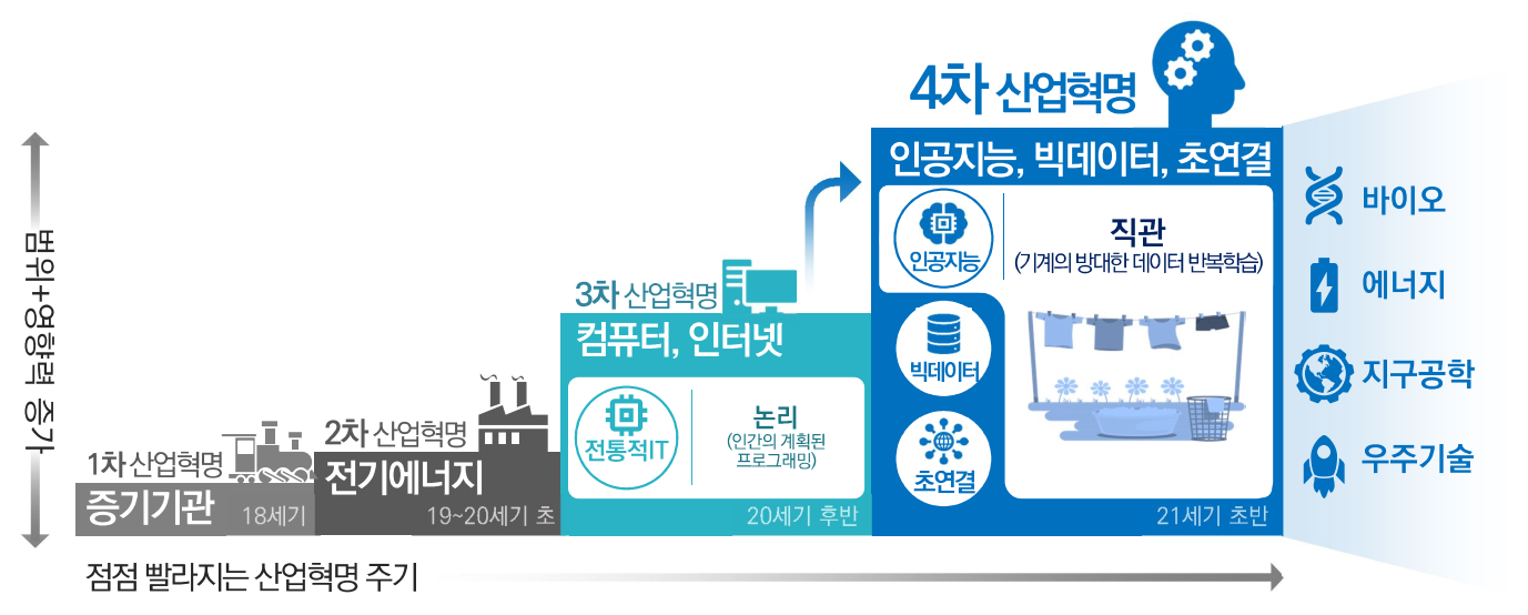 산업혁명은 새롭게 등장한 기술이 사회, 경제적으로 근본적인, 획기적인 변화를 가져오는 것을 말한다. 이를 테면, 증기기관에 의해 촉발된 1차 산업혁명은 농업사회를 공업사회로 전환시켰다. 전기 에너지, 내연기관에 의해 주도된 2차 산업혁명은 대량 생산 체제를 이끌었고, ICT에 의한 3차 산업혁명은 자동화를 주도했다. 4차 산업혁명은 인공지능, 사물인터넷, 클라우드, 빅데이터 등 데이터 활용 기술을 융합한 지능정보기술에 의해 주도되는데, 디지털(digital), 물리적(physical), 생물학적(biological) 공간이 융합되면서 이제껏 경험하지 못한 새로운 시대가 열릴 것이라 전망된다.