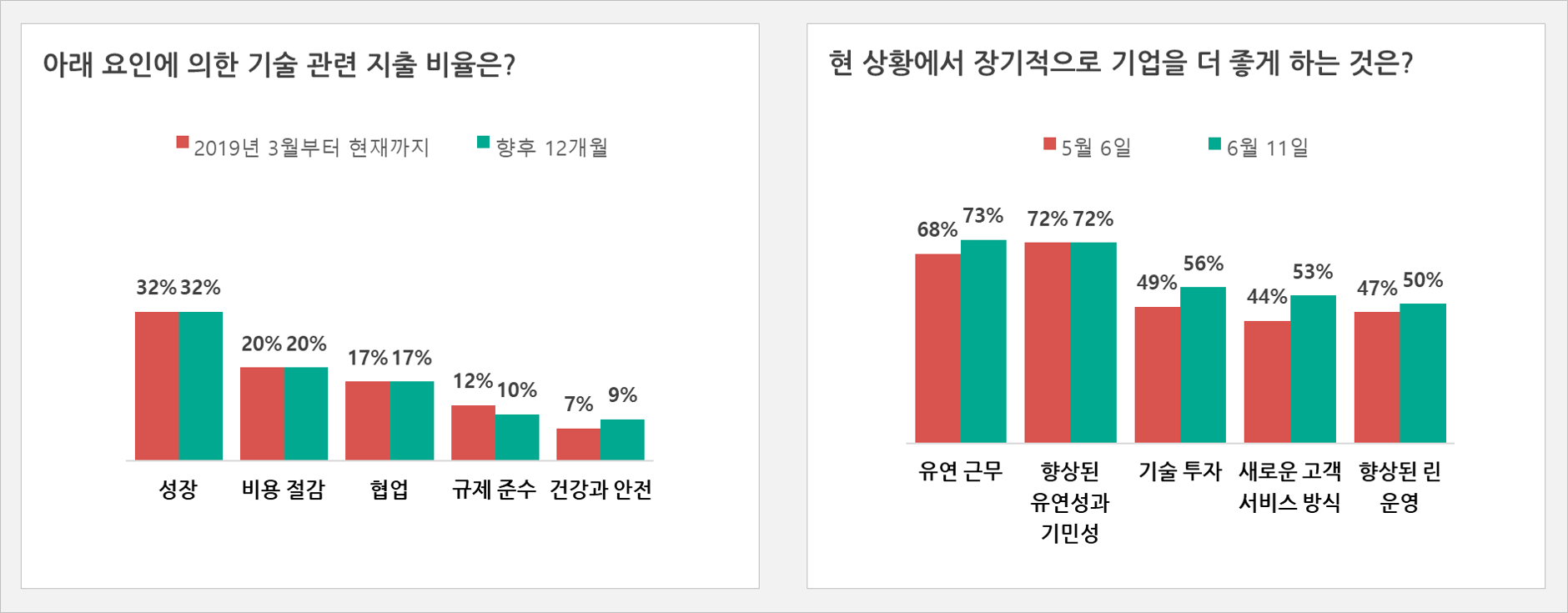 오히려 기업들은 코로나로 인해 디지털 전환의 필요성을 절감한 것으로 보인다. 현재 상황에서 장기적으로 회사를 더 좋게 만들 것인지 묻는 질문에 유연 근무, 향상된 유연성과 민첩성, 기술 투자, 새로운 고객 서비스 방식, 향상된 린(lean) 운영이 과반수 이상의 선택을 받았다. 특히 유연 근무, 기술 투자, 새로운 고객 서비스 방식은 한달 전(5월)보다 각각 5%, 7%, 9% 더 많은 선택을 받았다.
